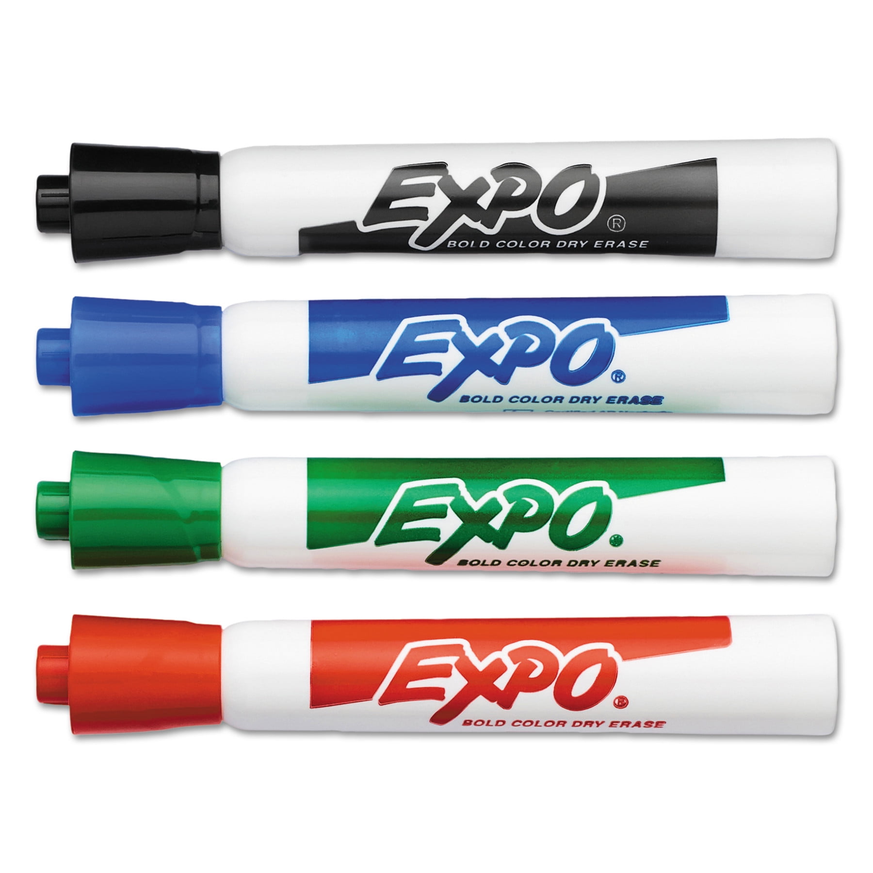 Four dry erase markers (one each of blue, green, black, and red) and one eraser, for use on dry erase boards and whiteboard walls.